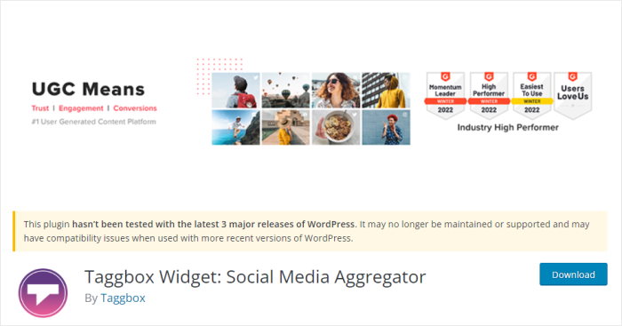 According to WordPress.org, the Taggbox plugin hasn’t been tested with the latest 3 major releases of WordPress.