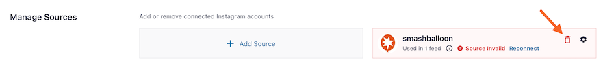 1- Gehen Sie zu Ihrem WordPress-Dashboard > Instagram-Feed > Einstellungen > entfernen Sie das/die verbundene(n) Konto/Konten, indem Sie auf das rote Papierkorbsymbol klicken, und klicken Sie dann auf die Schaltfläche Einstellungen speichern.