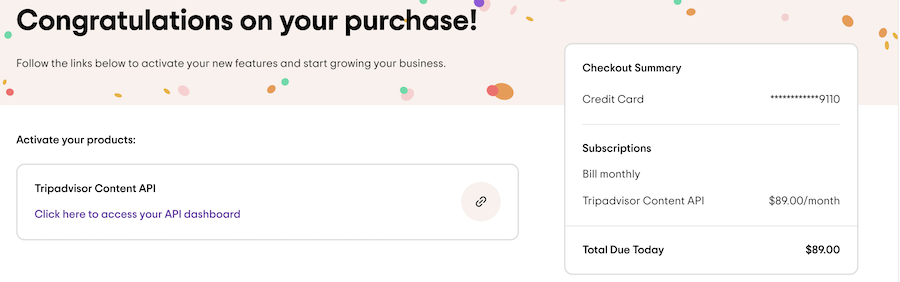 WICHTIGER Hinweis: TripAdvisor bietet keinen kostenlosen API-Schlüssel an. Um mit der Erstellung Ihres Schlüssels fortzufahren, müssen Sie Ihre Rechnungsdaten eingeben und die "TripAdvisor Content API" erwerben.