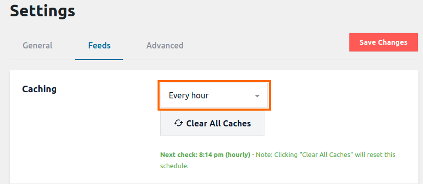 Es gibt einige häufige Gründe dafür, dass Ihr Feed nicht aktualisiert wird oder die Aktualisierung länger dauert als die Zeit, die Sie in der Caching-Einstellung unter WordPress Dashboard > Instagram Feed > Einstellungen > Feeds angegeben haben (Beispiel unten)