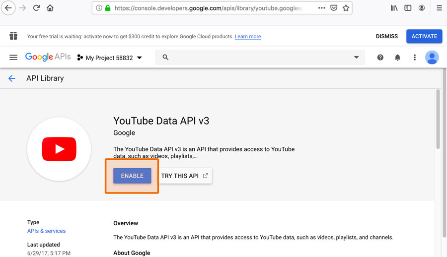 Sobald Sie die URL öffnen, wird der folgende Bildschirm angezeigt. Klicken Sie auf die Schaltfläche "Aktivieren", um den Zugriff auf die YouTube Data API v3 zu ermöglichen.