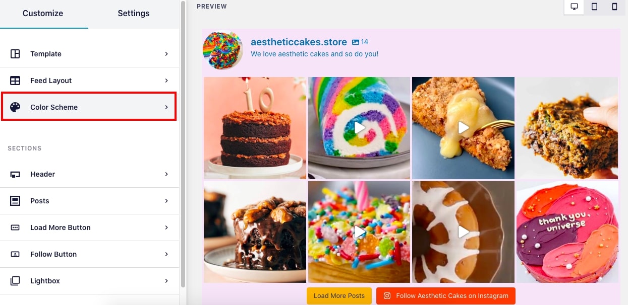 Jedes Mal, wenn Sie auf eine Anpassungsoption wie Vorlagen, Feed-Layouts oder Farbschemata klicken, wird die Vorschau in Echtzeit aktualisiert, damit Sie sehen können, wie es aussieht.