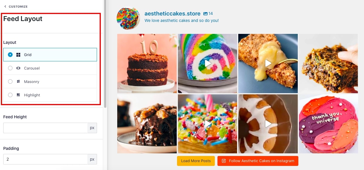 Als nächstes können Sie das Menü Feed-Layout auswählen. Hier können Sie verschiedene Layouts für Ihren Instagram Shoppable Feed auswählen, wie z. B. Gitter, Karussell, Masonry und Highlight.