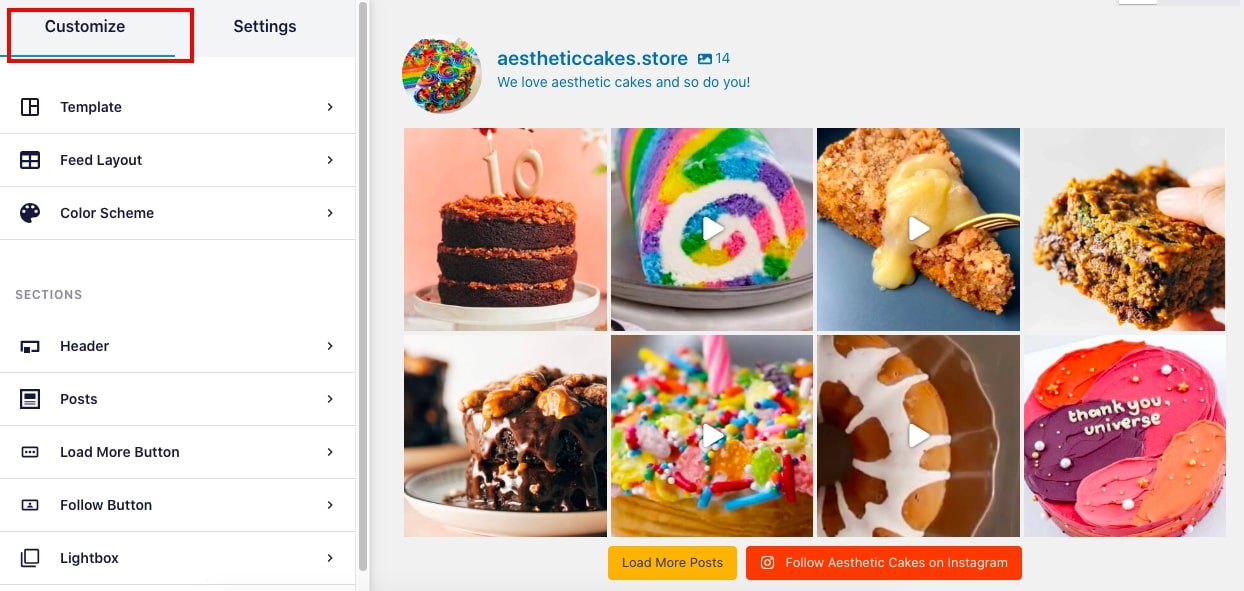 Mit dem visuellen Feed-Anpassungsprogramm des Plugins können Sie das Layout, die Vorlage, das Farbschema, den Header-Stil, den Beitragsstil, die Schaltflächen, den Leuchtkasten-Stil und vieles mehr Ihres Shoppable Feeds mit nur wenigen Klicks personalisieren.