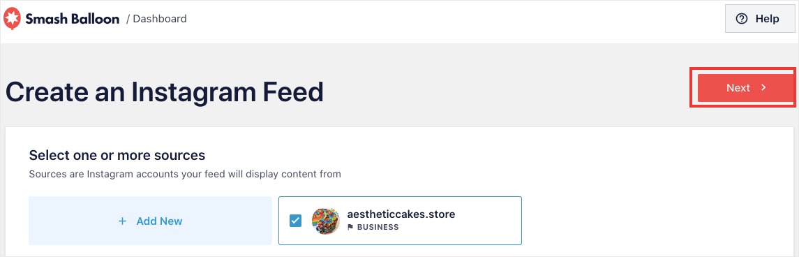 Nun werden Sie zurück zum Dashboard des Plugins geleitet. Um einen Instagram-Feed zu erstellen, aktivieren Sie das Kästchen neben dem Instagram-Konto, das Sie gerade verbunden haben, und klicken Sie dann auf Weiter.