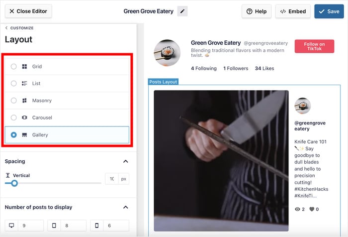 Nachdem Sie Ihre Vorlage ausgewählt haben, öffnet TikTok Feed Pro den visuellen Customizer. Von hier aus können Sie Ihr Layout, Ihre Kopfzeile, Ihre Videoelemente, Schaltflächen und vieles mehr frei ändern.