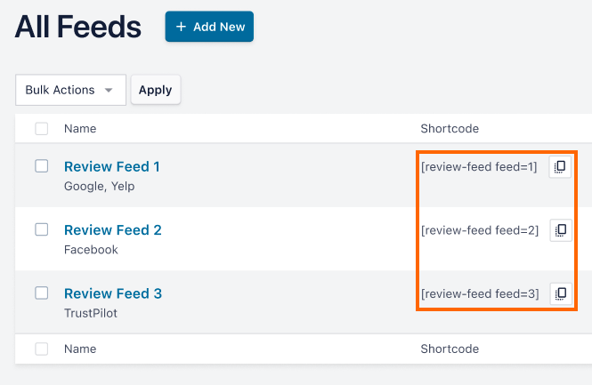 To create a new feed or view your existing feeds, go to WordPress Dashboard > Reviews Feed > All Feeds. On this page, you can click + Add New to create a new feed or you can view the shortcodes for your existing feeds in the Shortcode column.
