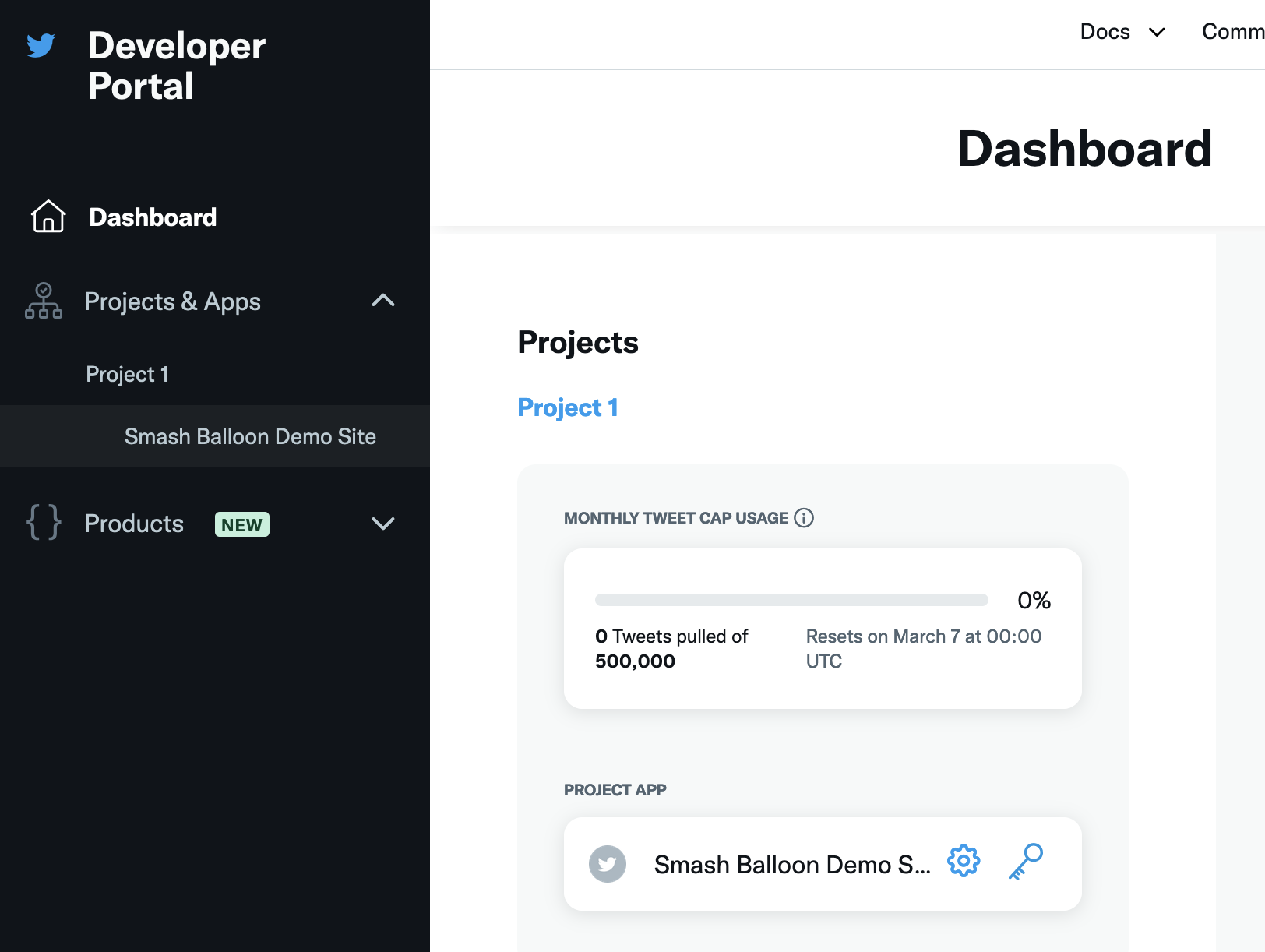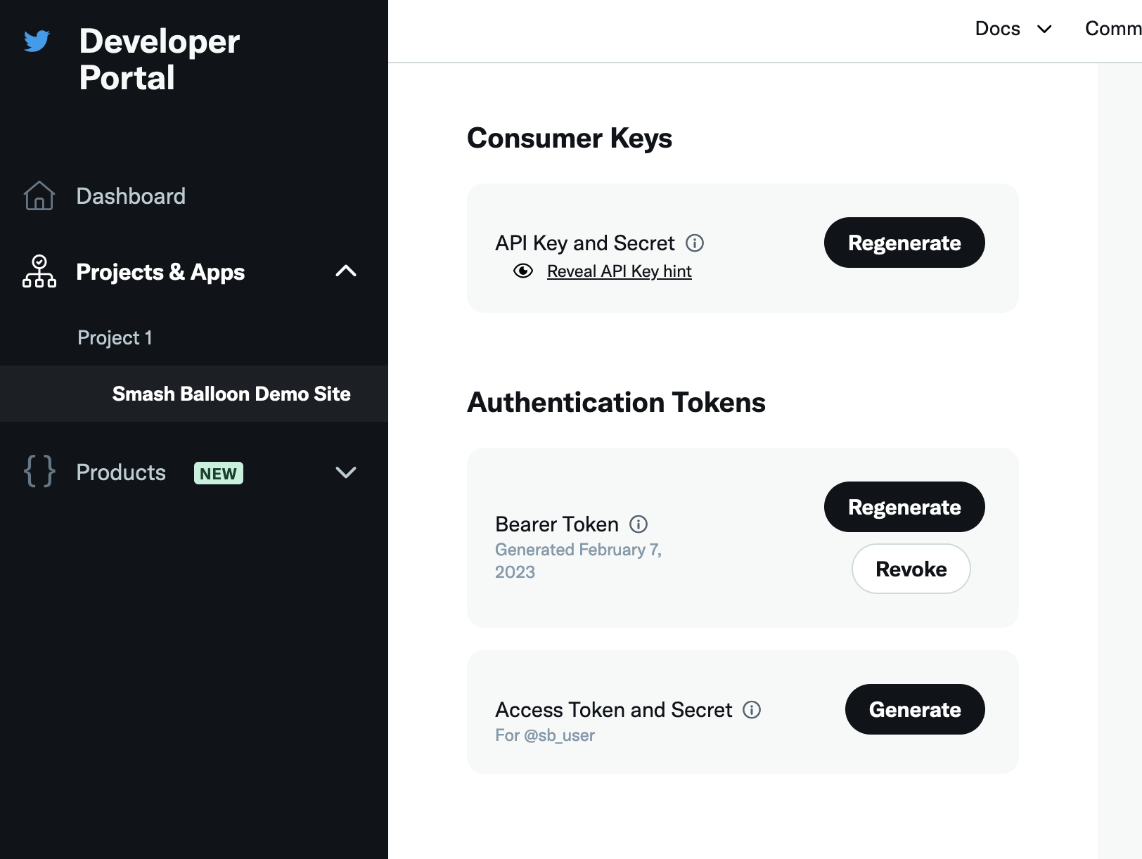 7) In the Developer Portal, select your newly created App that appears under the Project & Apps menu. This will allow you to generate an Access Token and Secret.