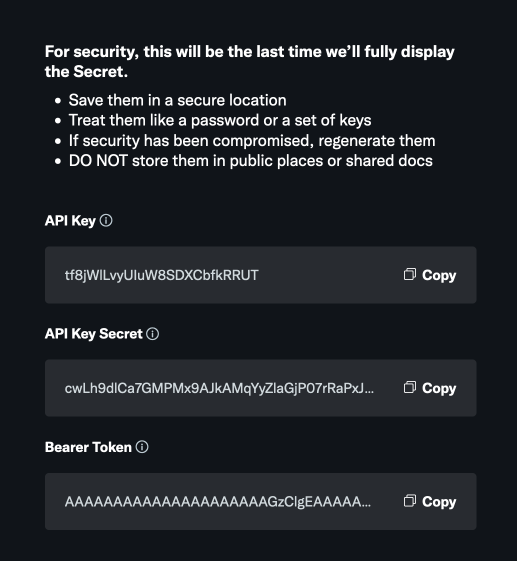 8) Generate an Access Token and Access Token Secret. Save these in a safe spot as you won’t be able to view them once you close the modal.
