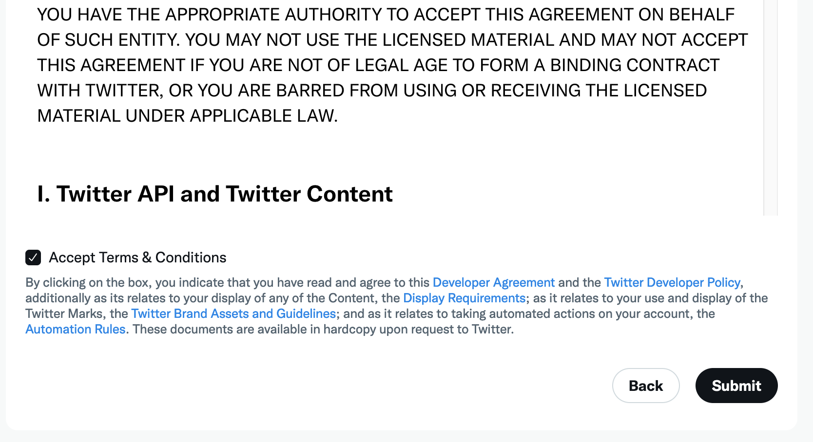3) You will need to agree to terms for using the Twitter API. Check the box and then click Submit