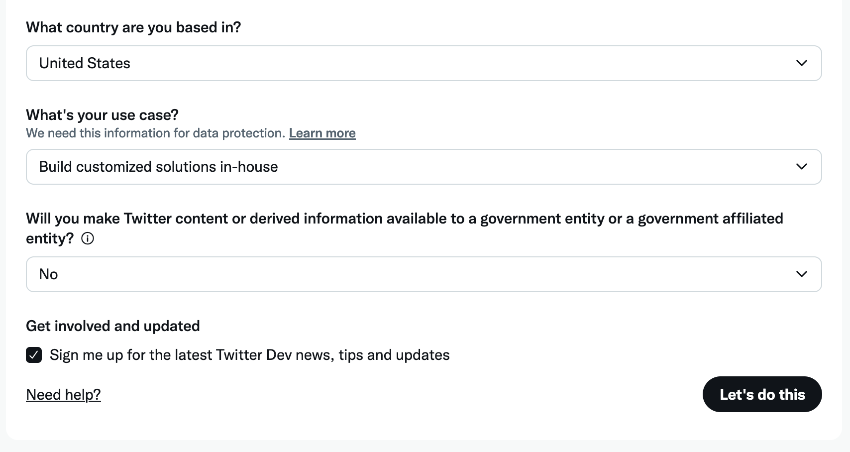 2) If this is your first time creating an App on Twitter. You will be asked for some basic information about the app you are creating. Enter the information as shown in this screenshot. Continue by clicking Let’s do this