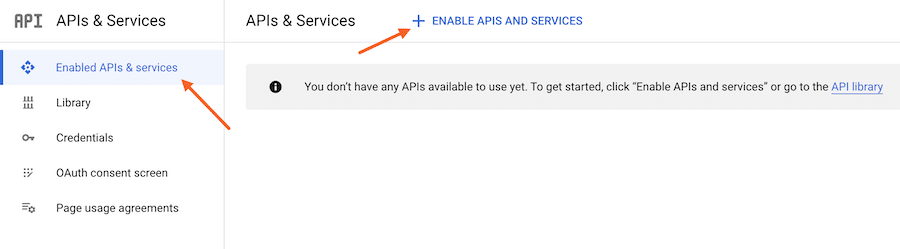 6) Navigate to “Enabled APIs & services” on the left side of the screen, then click the “Enable APIs and Services“