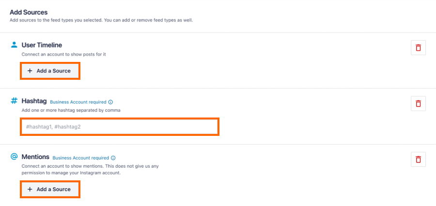 Note: It is only possible to display user feeds for accounts that you are able to log in to or have an Access Token for. Therefore, in order to display multiple users’ feeds, you will need to connect each account you want to display. However, you can still display multiple Instagram feeds if you have login access to multiple accounts, or by displaying hashtag feeds instead of user feeds.