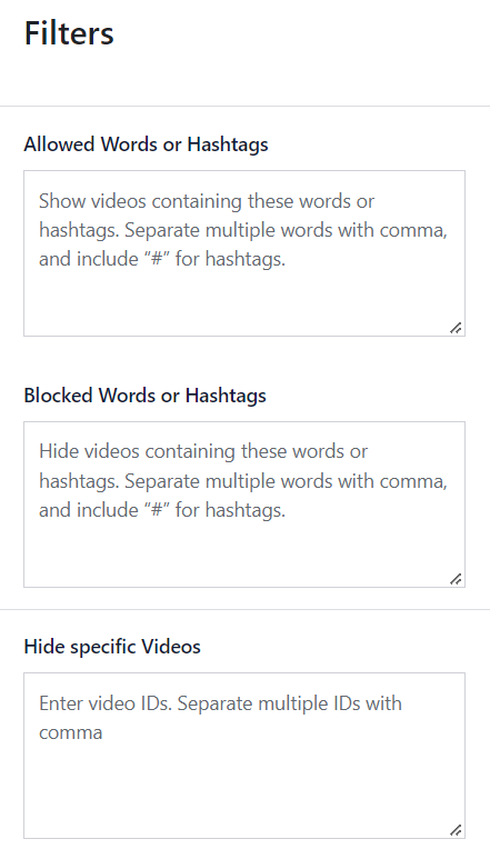 This option allows you to only show videos that contain specific keywords or hashtags. Separate multiple words with commas and include “#” for hashtags.