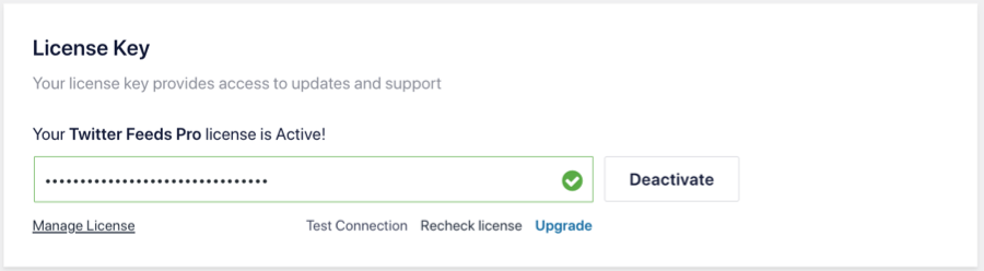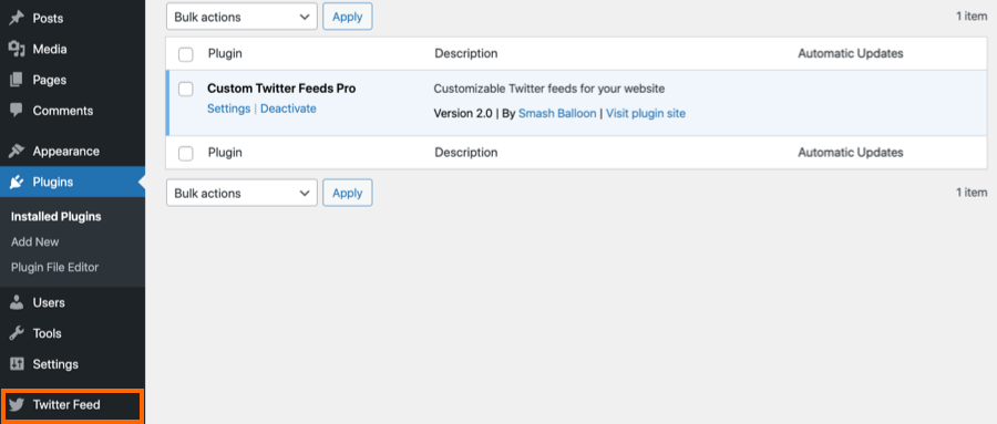 8) You’ll now see the Twitter Feed menu appear in your WordPress menu. Click on it and navigate to Settings to enter your license key.