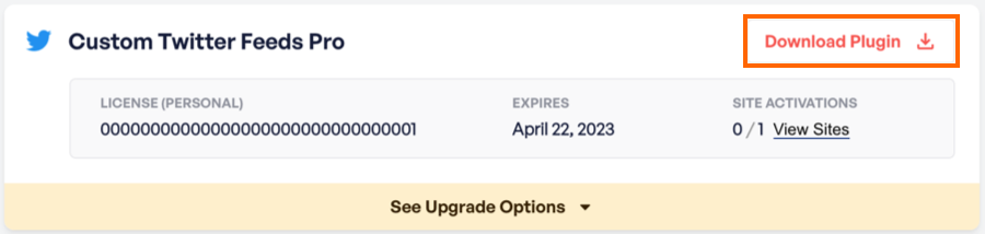 1) Once you’ve purchased the Custom Twitter Feeds plugin, click on the “Downloads” tab to download the plugin. Your download link, license key, and purchase information are also emailed to you at the address which you provided during checkout.