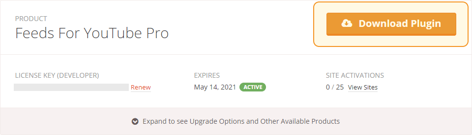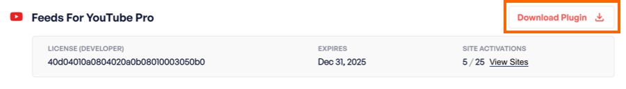 1) Once you’ve purchased the Feeds for YouTube plugin, click on the “Downloads” tab to download the plugin. Your download link, license key, and purchase information are also emailed to you at the address which you provided during checkout.