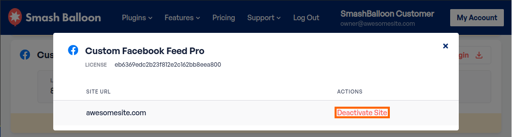 NOTE: When you deactivate a license (using the link under site management within your Smash Balloon user account), it will not change the setting in your own site database. (See screenshot above.) It only removes the registration from our database.
