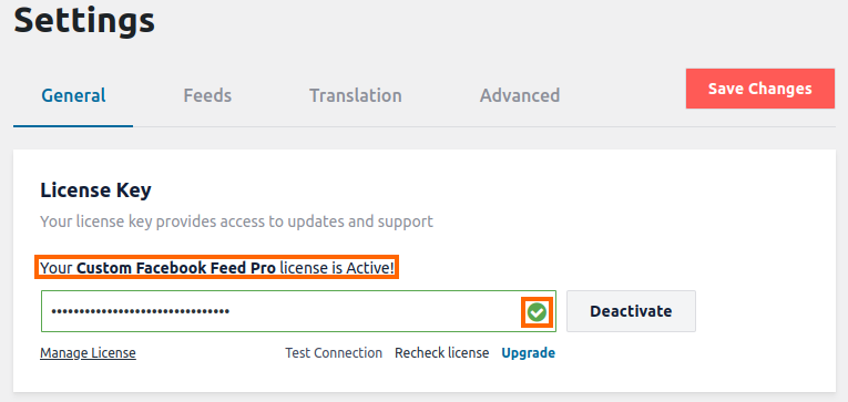 This means the license key will still be showing that it is activated within the plugin settings on your own site even though it is not registered in our database. (See screenshot below.) The reason this happens is that the activation settings you see in the plugin’s settings are reflective of what is recorded in your own site’s database but not what is recorded within the Smash Balloon database.