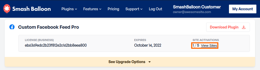 Site management can be accessed within your Smash Balloon user account by clicking on the “Downloads” section link. Next locate the plugin/license key that you wish to manage or review. Clicking on the “View Sites” link will allow you to see which site(s) are registered under the license key. (See screenshot below).