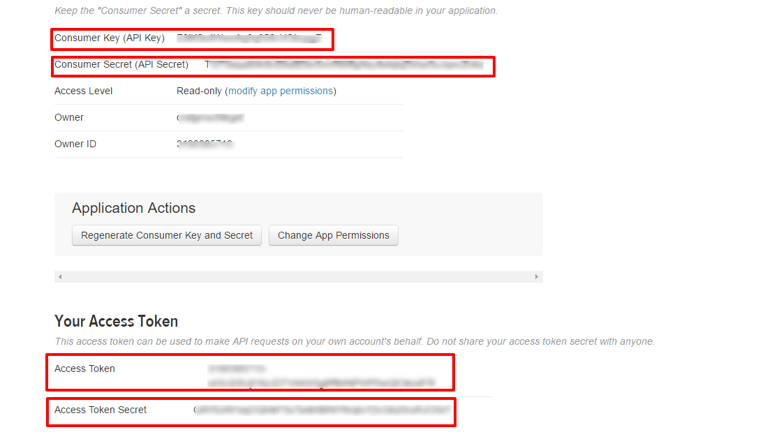 All four fields, consumer token, consumer secret, access token, and access token secret, need to come from the app that you set up on Twitter.com