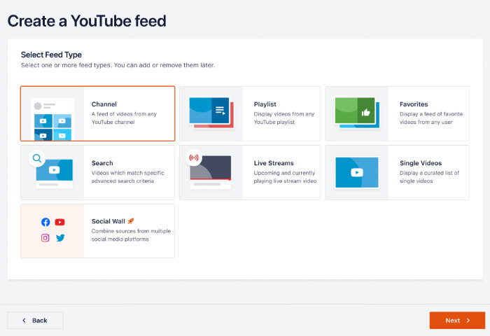 To continue, select the YouTube feed type you prefer and then click on Next.