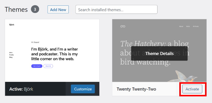 Here, look for a default WordPress theme like Twenty Twenty-Two and hover your mouse over it.