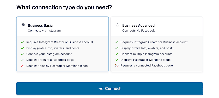 - Business Advanced: Recommandé si vous avez besoin de fonctionnalités supplémentaires telles que les flux de hashtags ou les mentions. Ce type de connexion nécessite de relier votre compte Instagram à une page Facebook.