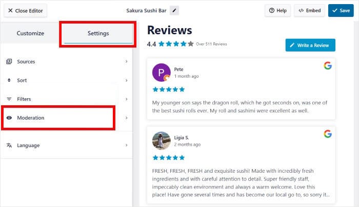 You’ll then see the reviews widget open in the plugin’s visual customizer. On the right, you have a live preview of your widget to track your changes easily.