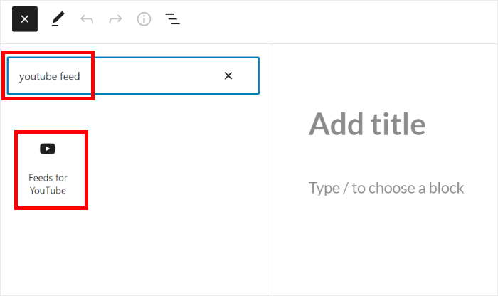 Type “youtube” into the search field and look for the Feeds for YouTube block. Click on it to add to your post.