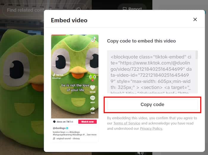 You’ll then see this TikTok video’s embed code here. By adding this code to your site, you can embed the video.