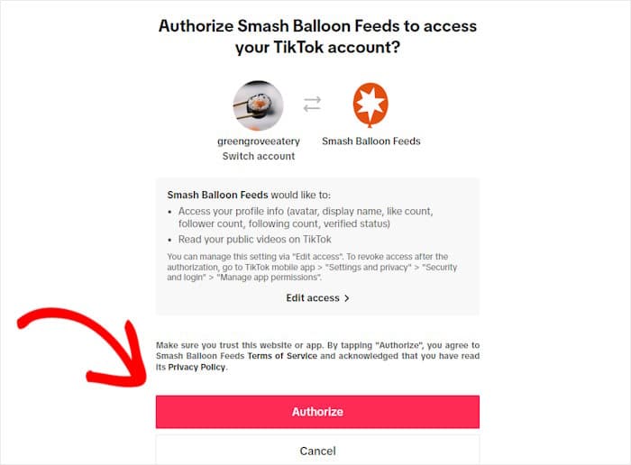 The plugin will now ask for read-only access to your TikTok account. Using this access, TikTok Feed Pro can view your TikTok info and show the videos on your site, but the plugin can’t make any changes.