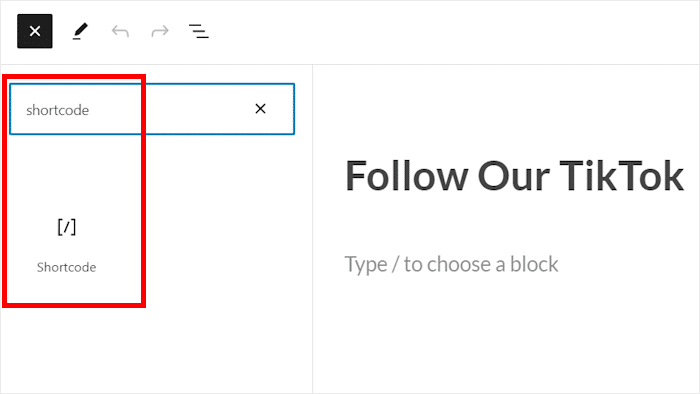 Next, search for “shortcode” using the search field and then select the Shortcode block from the search results below.