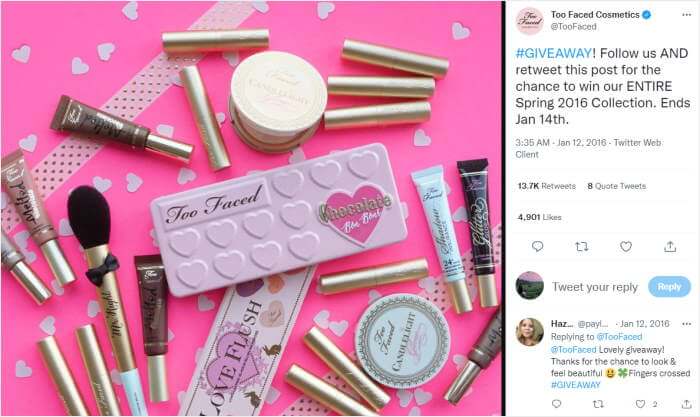 For example, you can look at this giveaway from Too Faced Cosmetics, where they gave out a sample of their products. People can then follow the account and retweet the announcement post to join the giveaway.