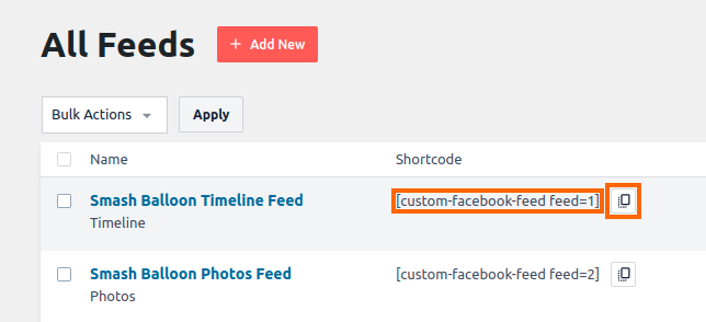Nota: il numero del feed potrebbe essere diverso da quello riportato in questo esempio. È possibile ottenere lo shortcode corretto navigando in WordPress Dashboard > Facebook Feed > All Feeds e controllando la colonna Shortcode. Il pulsante a destra del codice breve lo copierà negli appunti.