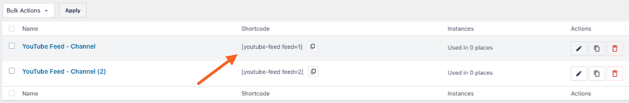 Per ottenere lo shortcode corretto per i vostri feed, andate su Feed per YouTube > Tutti i feed.