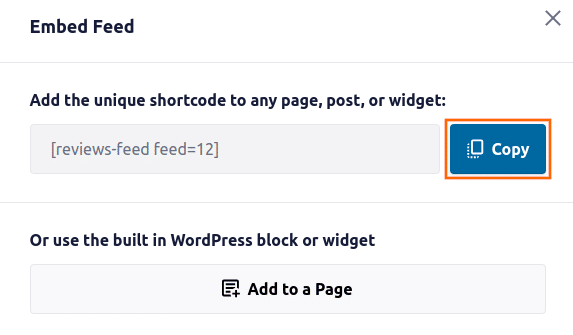 2) Dopo aver fatto clic su Crea feed, è possibile personalizzare il feed con le stesse potenti opzioni disponibili quando si creano feed attraverso il normale processo. Poi potete fare clic sul pulsante Incorpora e copiare lo shortcode unico per questo feed per aggiungerlo a qualsiasi pagina o area widget!