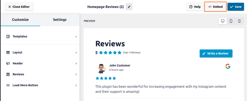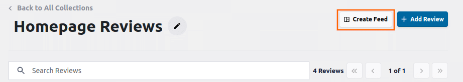 1) Una volta soddisfatti della selezione di recensioni, fate clic su Crea feed per creare un nuovo feed che visualizzi queste recensioni. La raccolta viene salvata anche come fonte di recensioni, in modo da poterla selezionare in seguito quando si creano nuovi feed, come qualsiasi altra fonte di recensioni!
