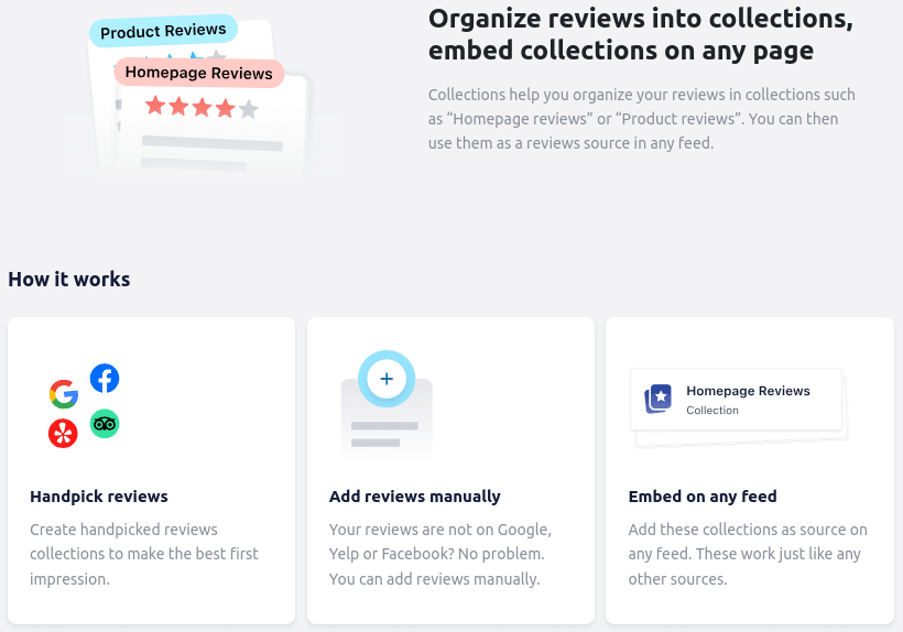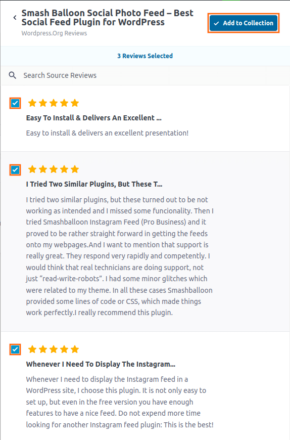 Con Collections, potete selezionare a mano le recensioni da qualsiasi fonte di recensioni, creare manualmente nuove recensioni e modificare quelle esistenti per creare collezioni di recensioni completamente curate e utilizzarle come fonte per i feed di recensioni! Questa funzione è stata aggiunta nella versione 1.4 del plugin Reviews Feed Pro, quindi aggiornate subito se non la vedete ancora!