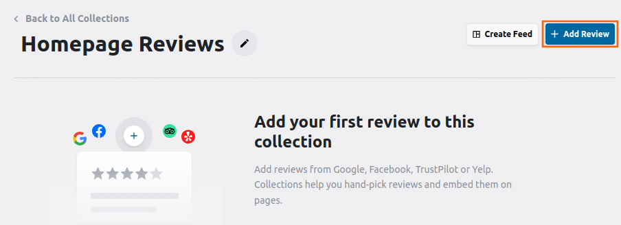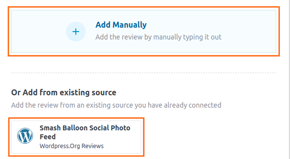 4) Fare clic su Aggiungi manualmente per creare una nuova recensione o fare clic su una delle fonti di recensioni esistenti per selezionare manualmente le recensioni da quella fonte da includere nella raccolta. Se non avete ancora collegato alcuna fonte di recensioni, potete consultare le nostre guide introduttive e la documentazione qui.