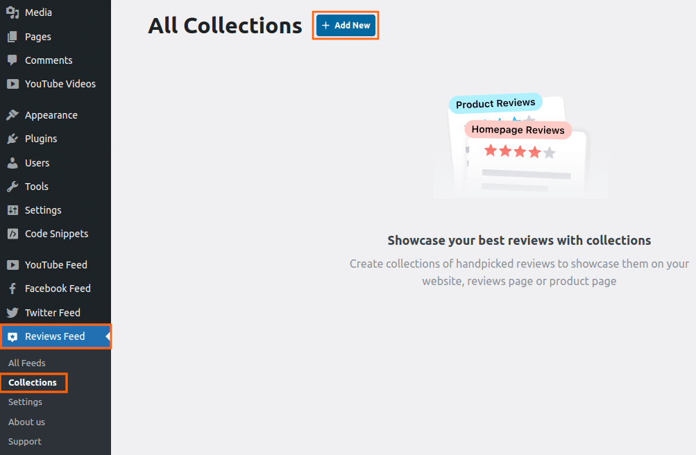 1) Accedere alla dashboard di WordPress > Feed delle recensioni > Collezioni e fare clic su Aggiungi nuovo