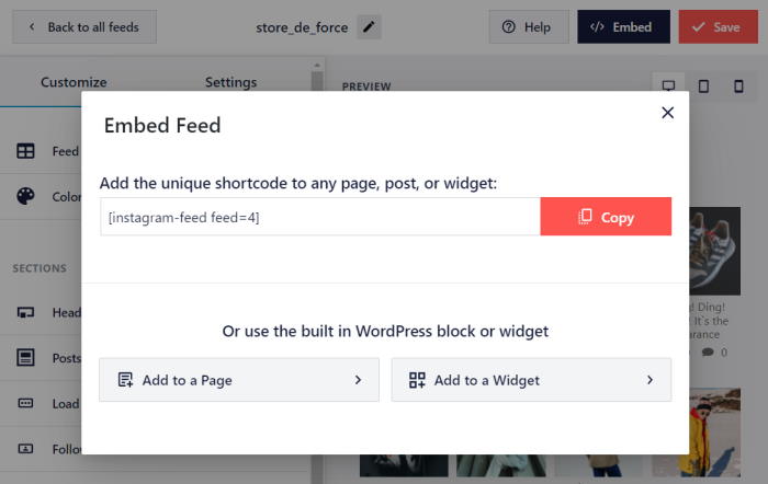 Una volta soddisfatti del design, basta cliccare sul pulsante Embed in alto per iniziare a incorporare il feed.