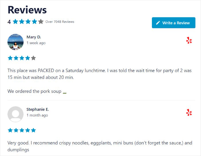 Inserendo le recensioni di Yelp, potete fare un ulteriore passo avanti e mostrare a tutti che tonnellate di persone hanno avuto un'ottima esperienza con il vostro marchio.