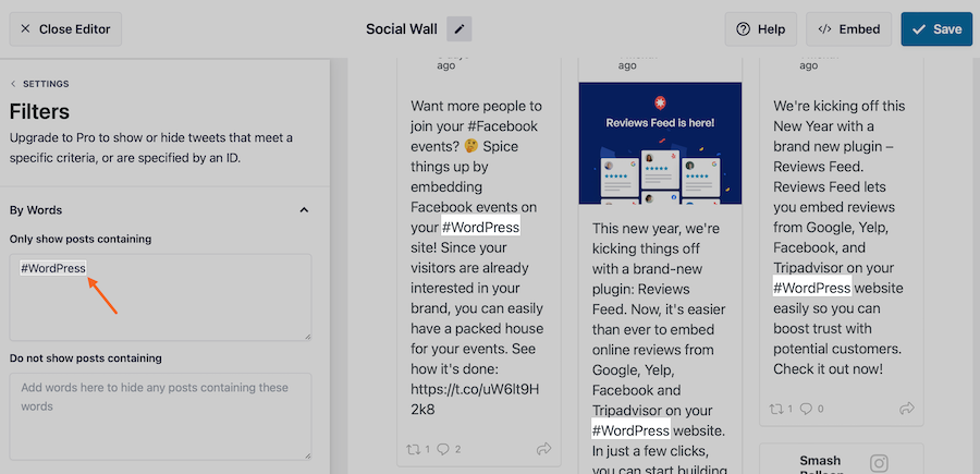 特定のキーワードを含む投稿を非表示にしたり、表示させたりするには、以下の場所にある「フィルター」オプションを使用します:WordPress Dashboard > Social Wall > All Feeds > Feed Settings (pencil icon) > Settings tab > Filters.