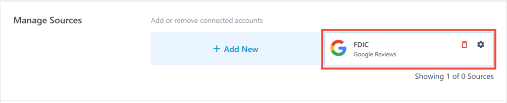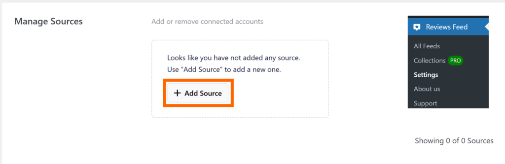 5) WordPressダッシュボードの「レビューフィード」>「設定」>「ソースの管理」セクションの「一般」に戻り、「ソースを追加」をクリックします。