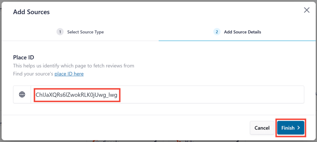 7)次のパネルで、プレイスIDをペーストし、"Finish "をクリックします。