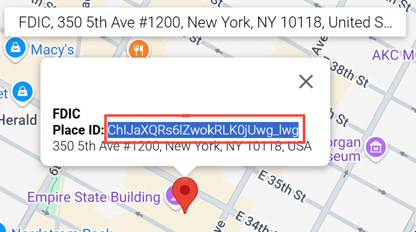 4) 地図上に表示される「Place ID:」の横にあるコードをコピーする。