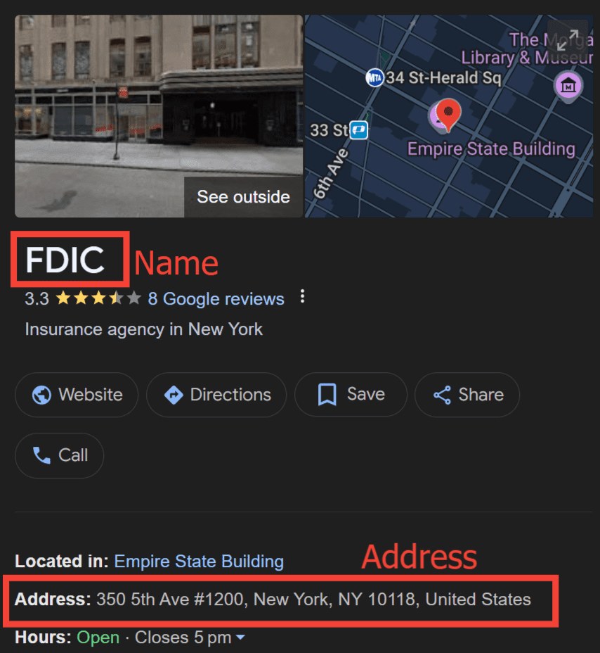 2) 次に、Google検索であなたのレビューロケーションの名前と住所を検索します。複数のロケーションIDが同じ住所を共有する可能性があるため、ロケーション固有の名前を使用するようにしてください。サービスエリアはレビューフィードには使用できませんのでご注意ください。検索結果ページのロケーションリッチ結果パネルから名前と住所をコピーします: