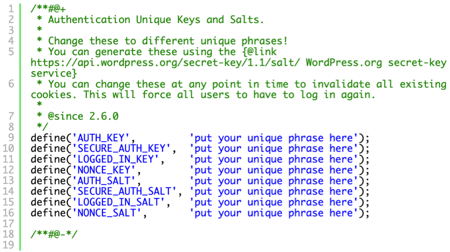Se não tiver chaves de segurança do WordPress ou não tiver a certeza de como criar um novo sal ou chave exclusivos, pode gerá-los aqui a partir do gerador de sal oficial do WordPress. Carregue a página e copie um valor de qualquer um dos campos para usar como seu Salt ou Key exclusivo para o nosso plugin usar. O resultado deve ser semelhante ao exemplo abaixo.