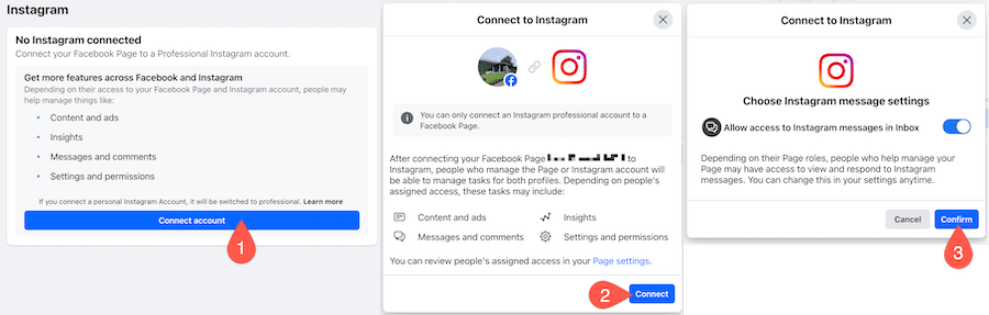 - Ligar a conta: Se ainda não existir uma conta ligada, verá uma caixa com a indicação "Nenhum Instagram ligado". Clique no botão azul "Conectar conta". Uma mensagem pop-up aparecerá mostrando quais opções serão ativadas. Clique no botão "Conectar" e, em seguida, clique no botão "Confirmar".
